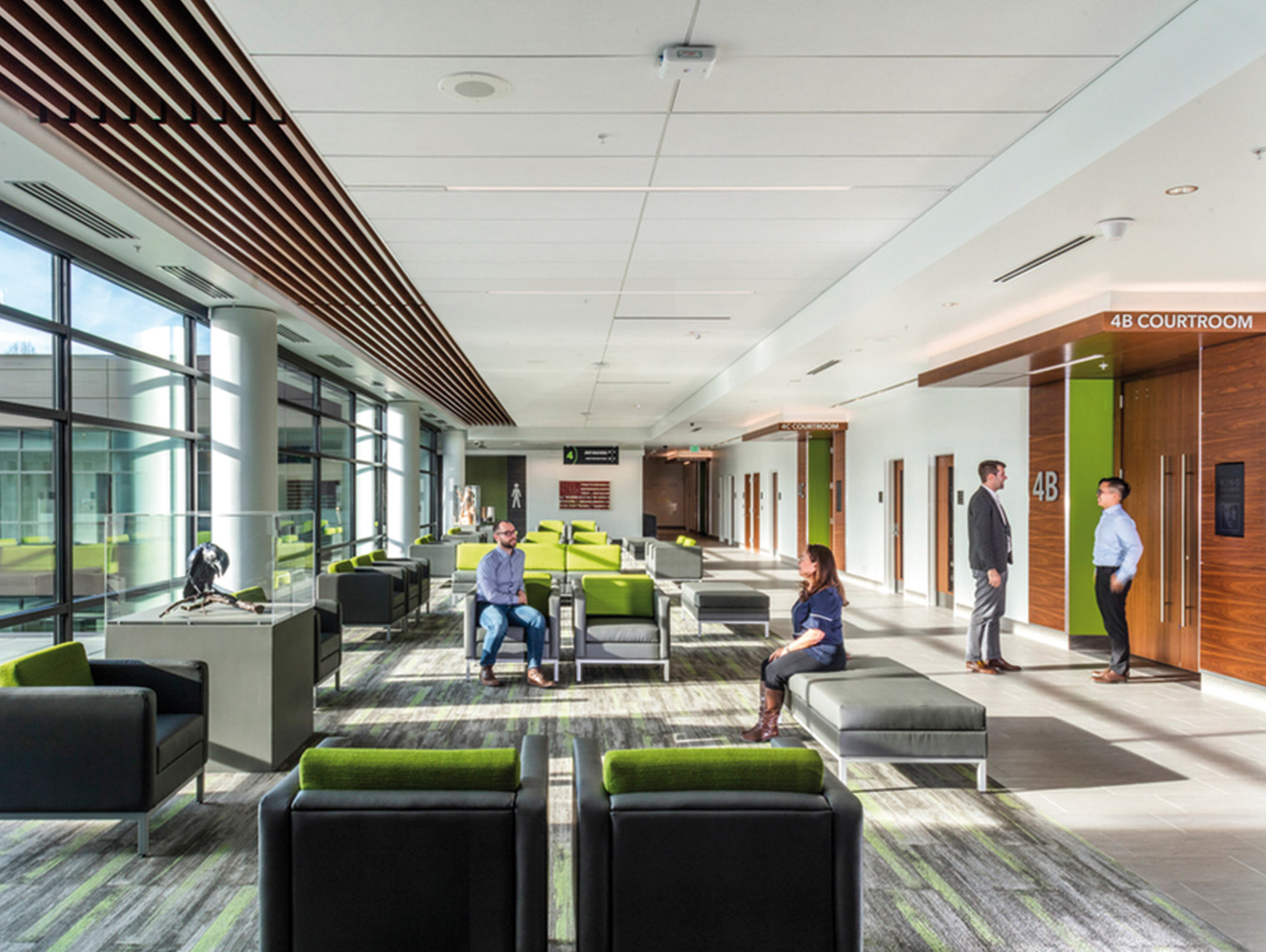 Simple but powerful interventions — clearer wayfinding inside and outside the building, improved signage, more dignified waiting areas, calming materials, access to daylight and views, choice in environment (stairs versus elevator, different waiting areas, etc.), and trauma-informed design — can have an outsized impact on restoring a sense of fairness and safety. These updates help everyone, from the first-time visitor to the long-serving judge, feel respected and secure in the space.